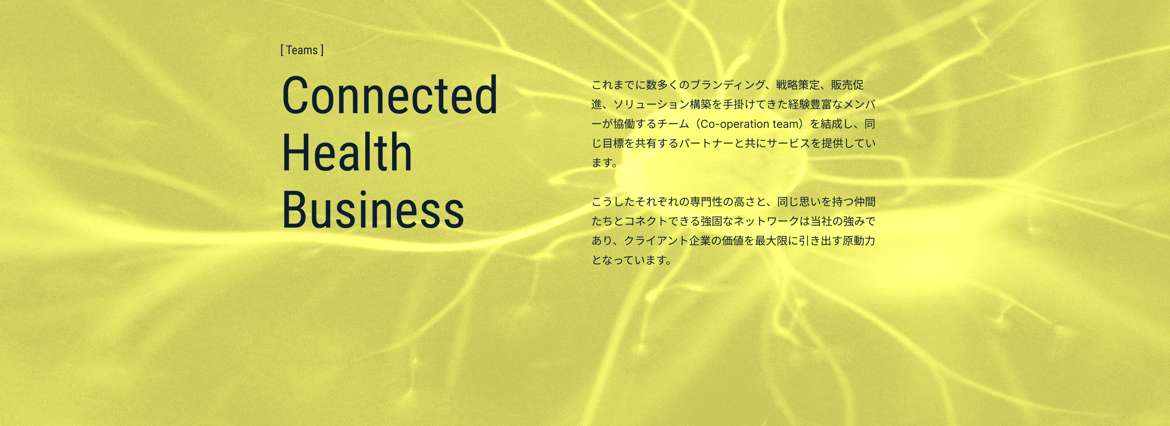 ヘルスケアビジネスの拡大、ブランディングに必要な知見を持った専門家をコアメンバーとして活動し、必要に応じてCo-operationチームと繋げ、活動領域を広げていきます。